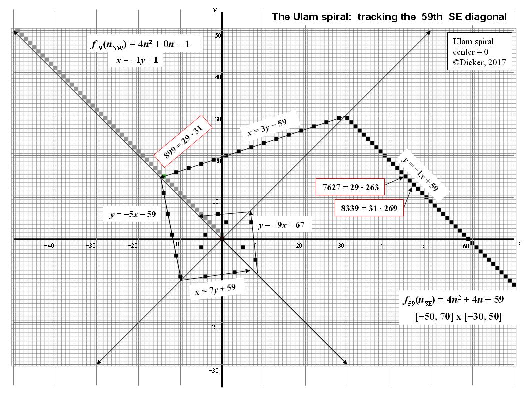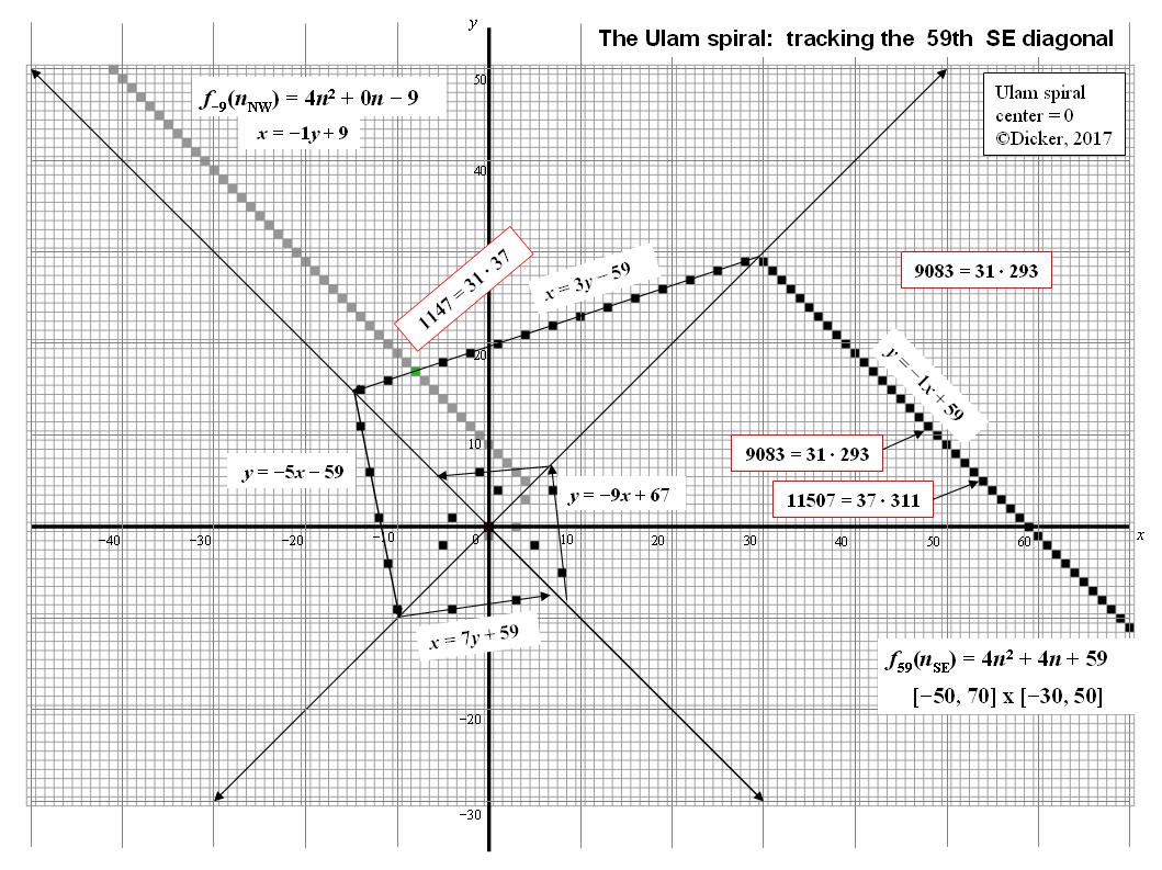 The counterclockwise  Ulam spiral  with  startvalue 59  played an important role in unraveling the  Ulam spiral  mystery.  The  SE main diagonal is interesting, since it is rich with prime numbers.