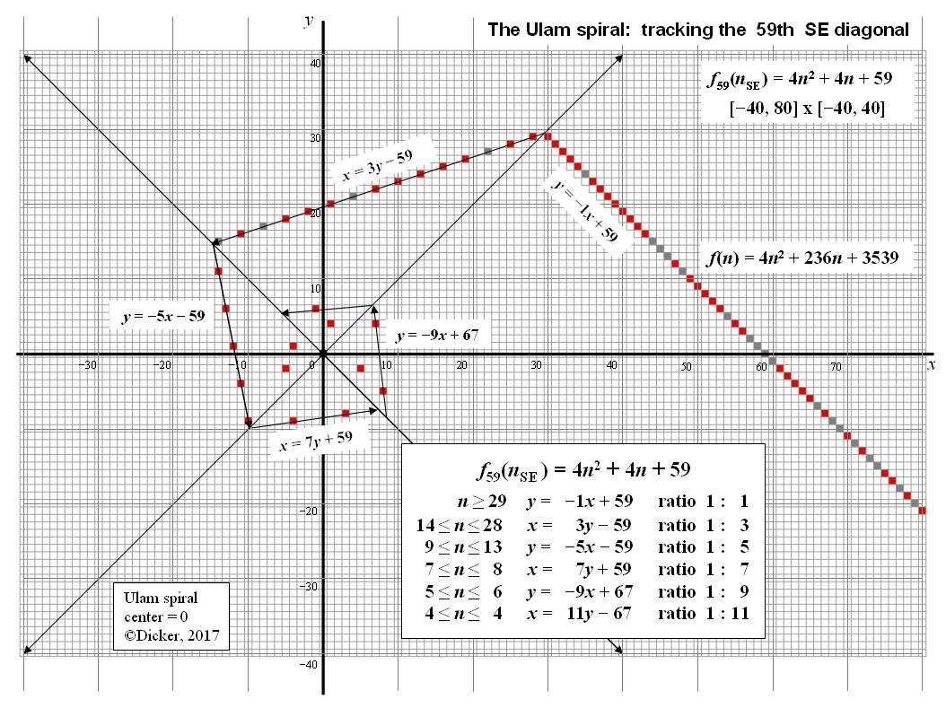 The Ulam spiral: The  59th SE diagonal   in a Cartesian coordinate system